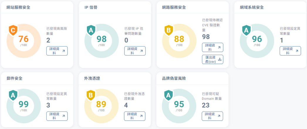 本次行動利用中華資安國際研發之「資安眼 HorusEyes 資安曝險評級服務」,從「駭客視角」用外對內Outside-In、非侵入式方式,導入AI與紅隊技術進行資通訊資產探勘,找出公司或機構在網際網路上的網站、系統、網路設備與雲端服務等,從七大關鍵維度進行深度剖析,包括網站安全、IP信譽、網路服務安全、網域安全、郵件安全、暗網外洩憑證、可疑偽冒網域等,協助社福團體快速檢視對外曝險態勢,並降低外部遭受攻擊的介面(external attack surface)。此外,資安眼部署於國內中華電信機房,檢測涵蓋最完整,還更能確保資料的留存與保護無虞。