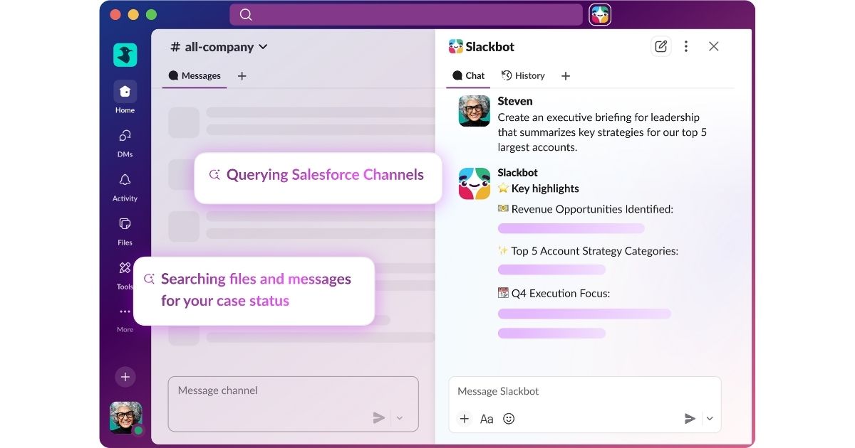 深度整合 Salesforce 客戶數據:透過與 Salesforce CRM 的無縫串接,Slackbot 能在會議前自動彙整客戶背景、年度經常性收入(ARR)與歷史互動紀錄,並結合 Slack 內部討論內容,協助團隊做出更具策略性的判斷。