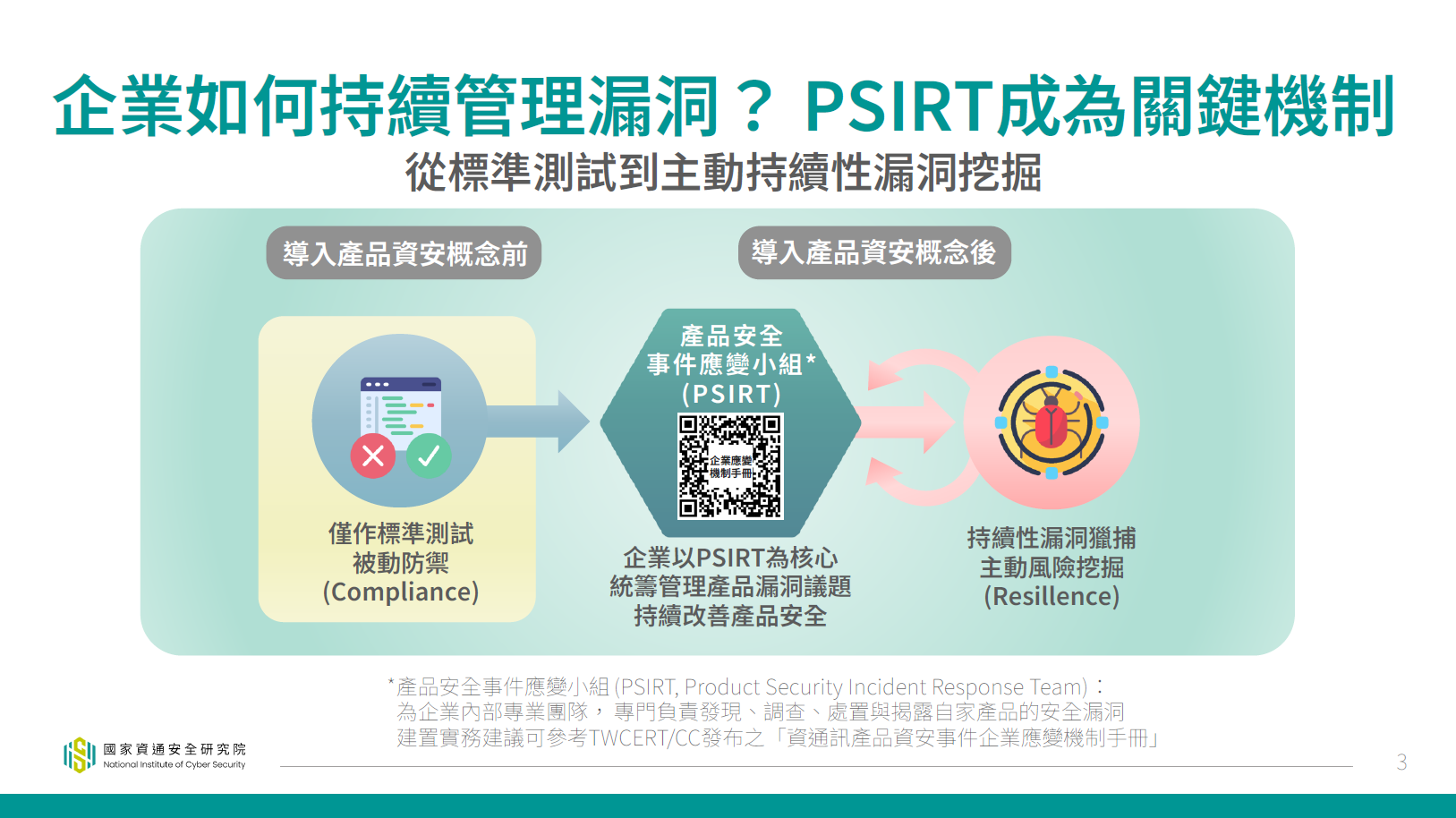 資安院指出,產品上市前經過標準測試仍然不夠,透過漏洞獵捕活動與上市前既有資安檢測程序相互補強,使廠商得以在產品上市前即掌握潛在問題,將原本可能於上市後才暴露的風險提前處理,進一步提升產品安全與市場信任。期許透過研究員挖掘、企業修補與第三方驗證公正性,建立漏洞揭露機制串聯產業與社群。