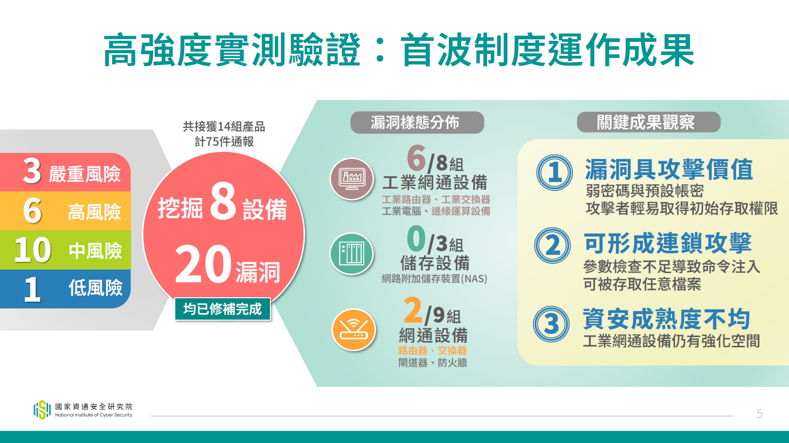 資安院表示,此次發現的漏洞中,部分元件因使用弱密碼可能導致任意檔案遭讀取,亦有因未妥善檢查參數輸入格式,而產生命令注入(Command Injection)風險等漏洞。