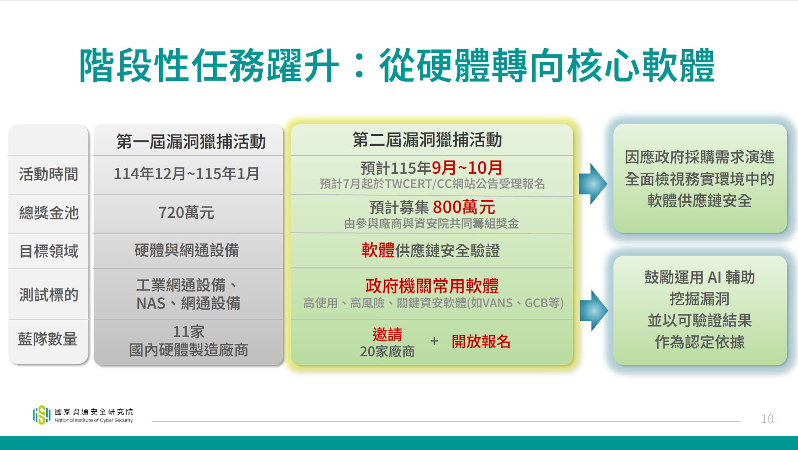 林盈達預告第二屆將有三大特色,首先是獎金提升至 800 萬元;其次,漏洞從嵌入式硬體轉向公務機關常用的純軟體系統,由於純軟體的複雜度遠高於硬體,預期漏洞數量將增加,更需要透過實證來確認;第三,將全面開放白帽駭客使用 AI 自動化工具,以提升測試效率與覆蓋率,「因為這樣火力才會更旺、效率更高,獎金可能發到爆掉」。