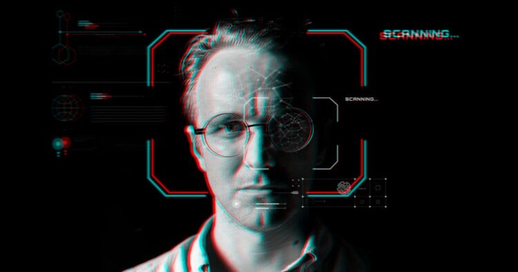 1200 Man Wearing Smart Glasses Virtual Scanning Technology Glitch Effect