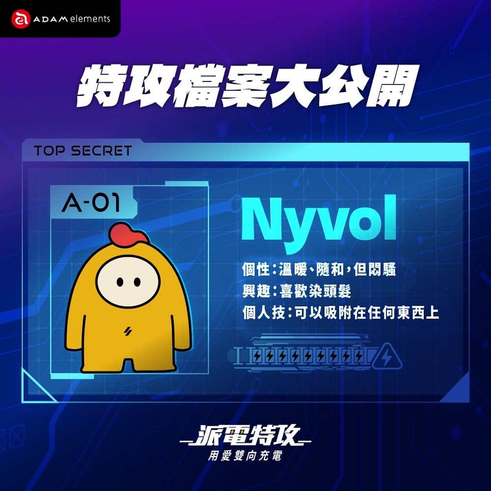 ADAM elements 亞果元素全新IP故事設定,來自於一組 2050 年的 AI 派電特攻(ADAM Friends),以人工智慧驅動的科技夥伴形象登場,每位角色擁有獨特個性與專業背景,致力解決電力挑戰並與用戶建立情感連結。目前已曝光的包括擔任能量穩壓官的 Nyvol,負責穩定調節充電能源;以及擅長炒熱氣氛的閃電萌探員 Jolly,協助掌握電場動態、傳遞用電新知。未來將解鎖更多新角色加入 ADAM Friends 宇宙,並且透過社群影片、互動漫畫及實體活動,傳遞正確用電知識,兼具教育與療癒功能。