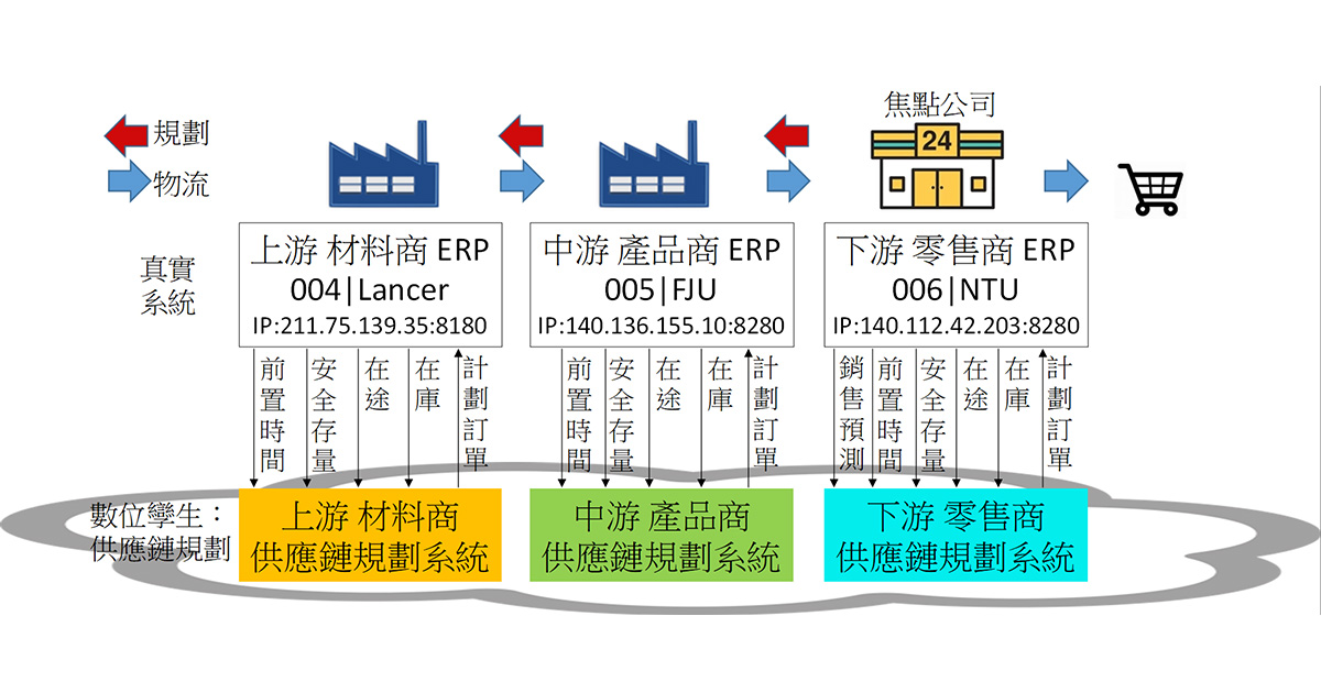SCM 孿生系統規劃零售商的材料需求時,先從第1個產品的第 1 期開始,往未來計算每一期的計劃訂單。最下游零售商各產品的銷售預測即其「總需求」(Gross Requirement),扣除 SCM 孿生系統的現有在庫量和本期的在途訂單量(預計收貨, Scheduled Receipt),若低於安全存量則計算產品的「淨需求」(Net Requirement),再往前移動一個前置時間即能算出該產品該期總需求所造成的計劃訂單。接著計算第1個產品的下一期,直到計劃期間(Planning Horizon)的最後一期,然後再計算下一個產品的每一期之計劃訂單,一直所有產品都計算完為止。下游零售商對中游產品商的各產品各期「計劃訂單」,就是中游產品商各產品各期的「總需求」,須交換到中游產品商承租戶的供應鏈規劃系統。中游產品商依照上述邏輯,可計算出中游產品商對上游材料商的各產品各期之計劃訂單,一直到算出供應鏈最上游的計劃訂單為止 [註 3]。以上計算過程全程都在 SCM 孿生系統 VPN 中進行,只有在規劃前 SCM 孿生系統從真實系統匯入有變動的主資料那一瞬間才會透過外部網路,可確保供應鏈的資料安全性。