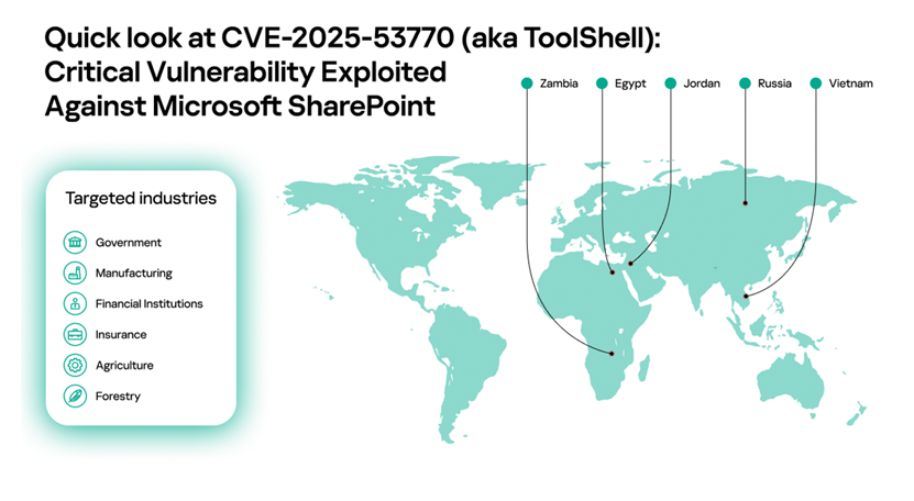 今年,這些 SharePoint 漏洞在被積極利用後,已成為重大的網路安全威脅。根據卡巴斯基安全網路(Kaspersky Security Network)的資料顯示,全球多地出現攻擊嘗試,包括埃及、約旦、俄羅斯、越南和尚比亞。這些攻擊針對政府、金融、製造業、林業與農業等領域的組織。卡巴斯基的解決方案在這些漏洞公開前即主動偵測並攔截了 ToolShell 攻擊。