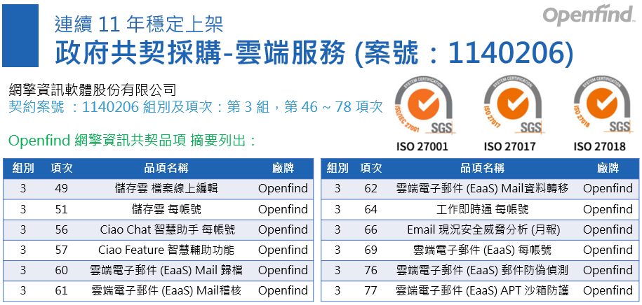 Openfind 網擎資訊連續 11 年成功入選政府共同供應契約平台-雲端服務採購項目,除了持續提供台灣公務機關好口碑的安全電子郵件、檔案分享雲、及工作即時通,本次更增加 Ciao 智慧方案及帳號威脅分析月報服務。今年適逢網擎雲端 25 週年,廣獲公務機關好評採用及連年 25% 以上銷售成長,網擎是實至名歸的優質雲端服務商。通過 ISO27001、ISO27017及ISO27018 國際認證,專業化流程嚴謹守護用戶組織機密情報、並具備良好的數據及個資專業保護力與風險控制措施。網擎資訊更是優秀的台灣企業,於 2024 年甫獲國家磐石獎肯定,展現台灣本土軟體開發商持續茁壯的營運韌性,在進一步跨足雲端服務領域仍具有表現亮眼的國際競爭力。