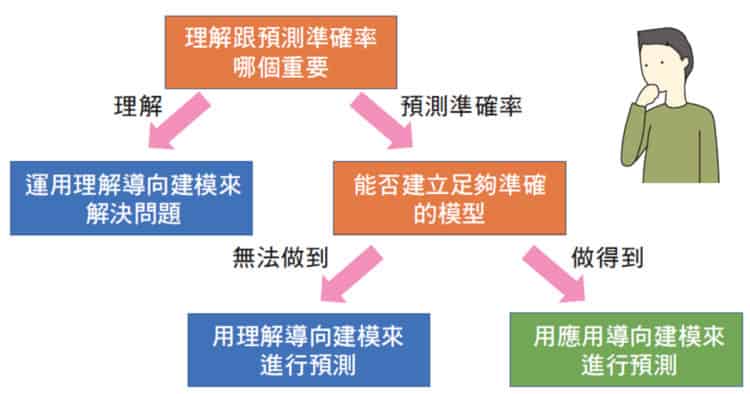 對於「要開發什麼樣的創新商品才能暢銷」,除了需要「尋找過去成功的經驗」,也許更需要「理解市場趨勢」。因此,使用理解導向建模(比如蒐集一些市場調查的問卷後,接著使用統計建模來分析市場可能的走向),而非建立應用導向的預測模型,可能會更適合處理這個問題(圖1)。