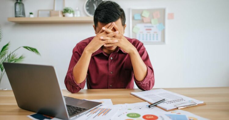 1200 man working with laptop paperwork with stress