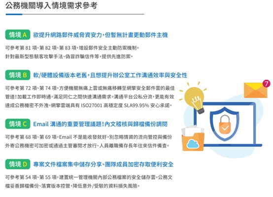 提高數位韌性 (或是資安韌性) 是公部門持續耕耘的議題,而變化莫測的國際局勢加速了推動數位轉型的節奏。架構彈性且導入快速的雲端服務,成為資訊人員相當倚重的資服工具,在 Cloud Service 百花齊放的後疫情時代,網擎資訊近年更貼心推出「機關資安需求導入指引」,方便機關快速找到經濟又合適的雲端方案。欲提升郵件資安力,但暫無計畫更動郵件主機的機關,可參考 SaaS 第 3 組第 81 項郵件網址分析、第 82 項郵件防偽偵測、或第 83 項 APT 沙箱防護等,針對新型態駭客攻擊手法,提供先進防禦。Openfind 網擎資訊產品設計有口皆碑,接連榮獲 BC 資安獎、台灣精品獎殊榮肯定,淬鍊資安不遺餘力、悉心研發值得信賴!