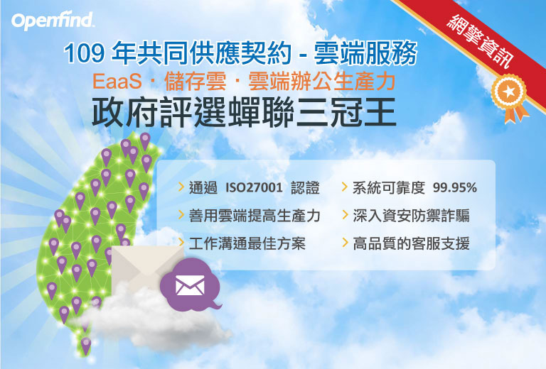 近日國內知名雲端服務商網擎資訊(Openfind)一舉榮獲 109 年共同供應契約雲端服務標「雲端電子郵件(EaaS, Email as a Service)」、「儲存雲」及「雲端辦公生產力」評選三冠王!連續 5 年獲得冠軍之殊榮,也是唯一獲得評選委員青睞認可的雲端服務商。網擎資訊致力於持續提高國內資服與資安水準的實力與努力,擁有超過 20 年的郵件服務經驗,不但通過 ISO27001 認證,更達成 99.95 % 以上的服務層級協議(SLA, Service Level Agreement),在臺灣更已累積數百家的政府機關導入使用。