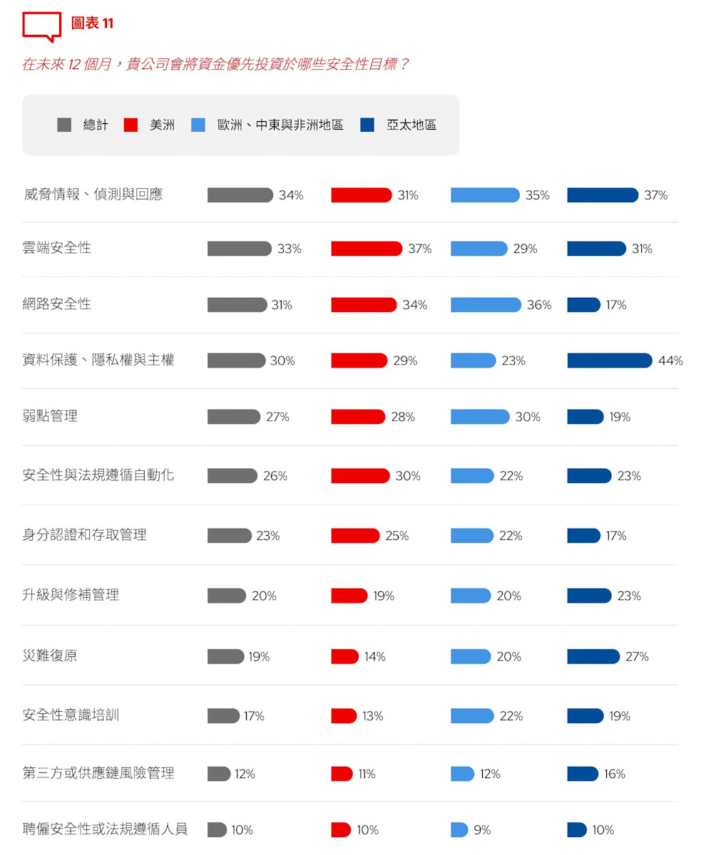 整體而言,三分之一受訪者將威脅情報、偵測與回應(34%)和雲端安全性(33%)視為優先投資項目。相較於網路安全性(17%),亞太地區的受訪者更加重視資料保護、隱私權與主權(44%)以及災難復原(27%)。